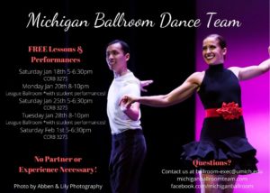 - American lessons this semester: Mark your calendars for these upcoming American style lessons! Steve and Susan will be running Bronze American lessons open to A-PreC teams on Monday February 3rd and Monday February 17th, and a Silver American lesson for A-B teams on Monday February 10th, so save the dates and keep an eye out for an email from your fabulous Curriculum Chair Madeline with more details and sign up! You don’t have to attend with your regular partner if they can’t make it. All American lessons are free to attend and will be 7-9pm in Steve and Susan’s studio.